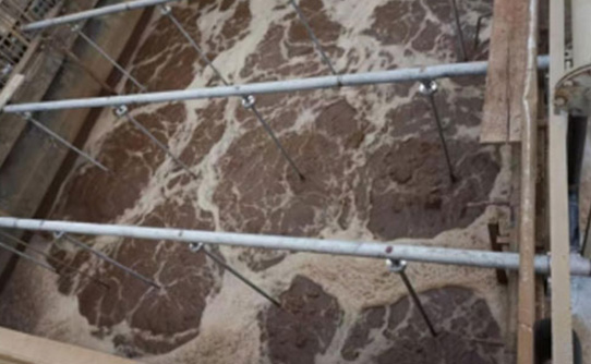 該項(xiàng)目改造后運(yùn)行正常穩(wěn)定,解決了硝化池好氧曝氣堵塞氧利用率下降的問題,出口溶氧均在2.0以上。鼓風(fēng)機(jī)出口壓力基本較之前降低了約15kPa,旋流曝氣水花,可將水面的泡沫推開,長久運(yùn)行一直如此的話,可以將消除泡沫的泵部分停用;大幅度降低運(yùn)保日常清理更換管式曝氣器工作量和費(fèi)用。原先維護(hù)一組設(shè)備至少6人,現(xiàn)在幾乎不需要再安排人手,平時(shí)巡視即可。